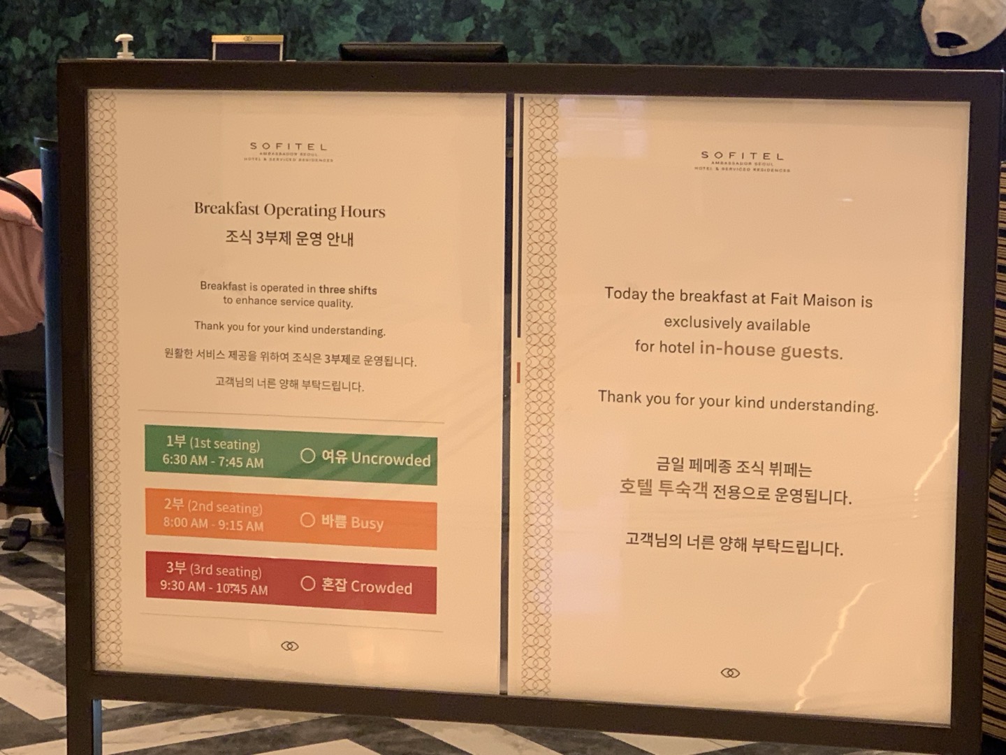 조식은 에그 스테이션이 꽤나 괜찮았고 계란 요리도 매우 수준급으로 잘해주시는 편이다. 소피텔은 특히나 빵의 퀄리티가 좋았는데 각종 빵들이 전부 맛있었다. 그리고 의외로 아침부터 삼겹살과 커리 닭고기가 굉장히 맛있어서 과식을 하게 되는 부작용도 있었다. 조식을 평소에 잘 이용하지 않는 편임에도 소피텔 조식은 적극 추천한다.